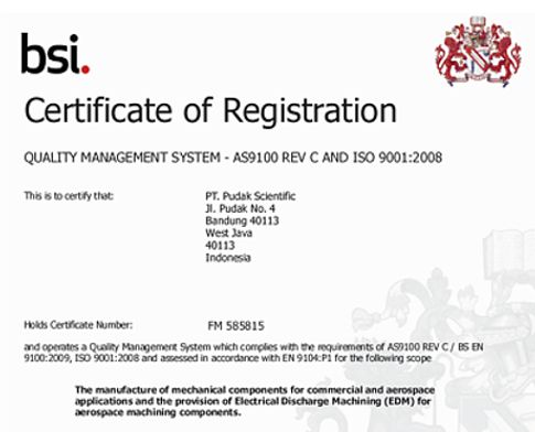 Setelah melalui beberapa tahapan yang dilakukan oleh badan sertifikasi, dalam hal ini adalah BSI Korea, PT. Pudak Scientific berhasil mendapatkan Sertifikat AS9100 - sertifikasi yang merumuskan standar sistem manajemen mutu untuk industri kedirgantaraan. Sertifikasi ini menunjukkan, bahwa PT. Pudak Scientific telah melampaui standar kualitas ISO9000.